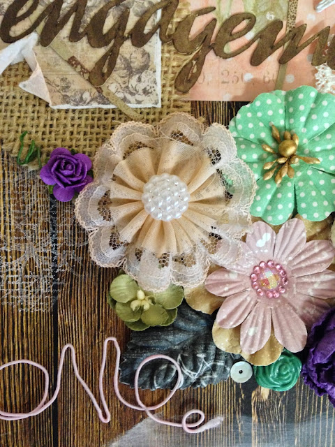 I used a leftover 12x12 sheet of woodgrain paper from wedding invitation making then layered on a leftover burlap pennant from the wedding, a whole bunch of Prima papers and flowers, along with other flowers and vintage elements.