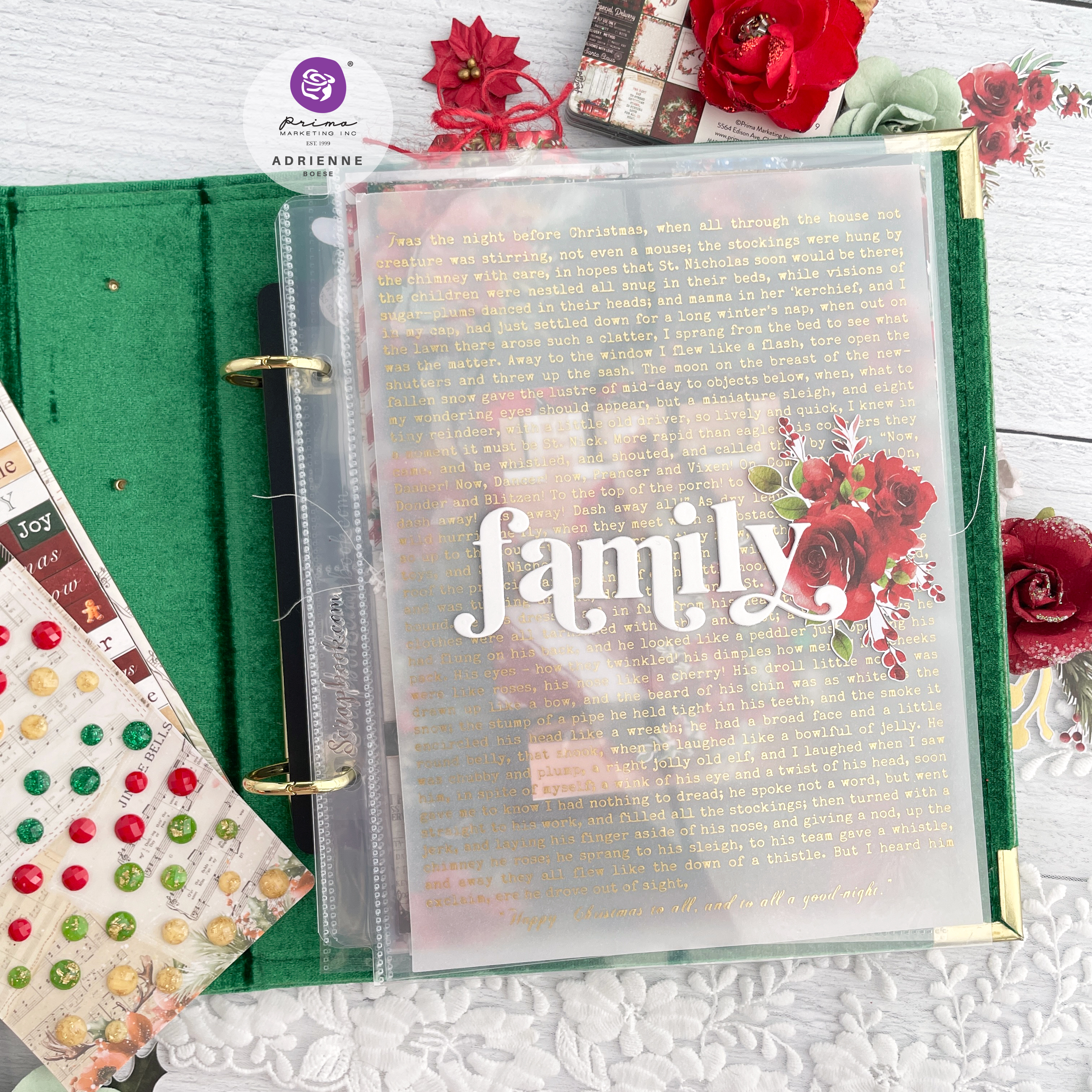 We'll come back to the cover of this album in a moment because I want to focus on what's inside the album first. I always love putting a title page in for the first page. This album is photos of family and family traditions at Christmas, so it added a die cut title of "family." This title is three layers of cardstock for each letter and glued to the outside of the pocket page. I also tucked a From the North Pole floral ephemera piece behind the title. Inside the pocket is one of the vellum sheets from the 6x8 paper pad in the collection.