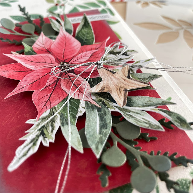 I then used some Smart Glue to adhere the die cuts to the red mat. Next I used foam adhesive to pop the poinsettia on. I then added a touch of glitter to the leaves with the Scrapbook.com glitter brush marker. Then I punched a hole through the top of the star with a pin and then added a bow of silver metallic thread and then popped it on with more foam adhesive.