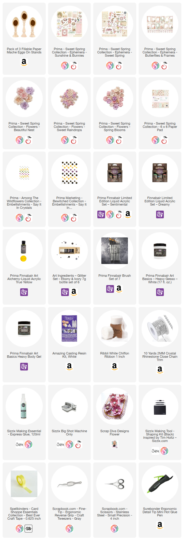 Scrapbook.com, A Cherry On Top, Sizzix, Prima Marketing, Spellbinders, Scrap Diva Designs, Etsy & Amazon